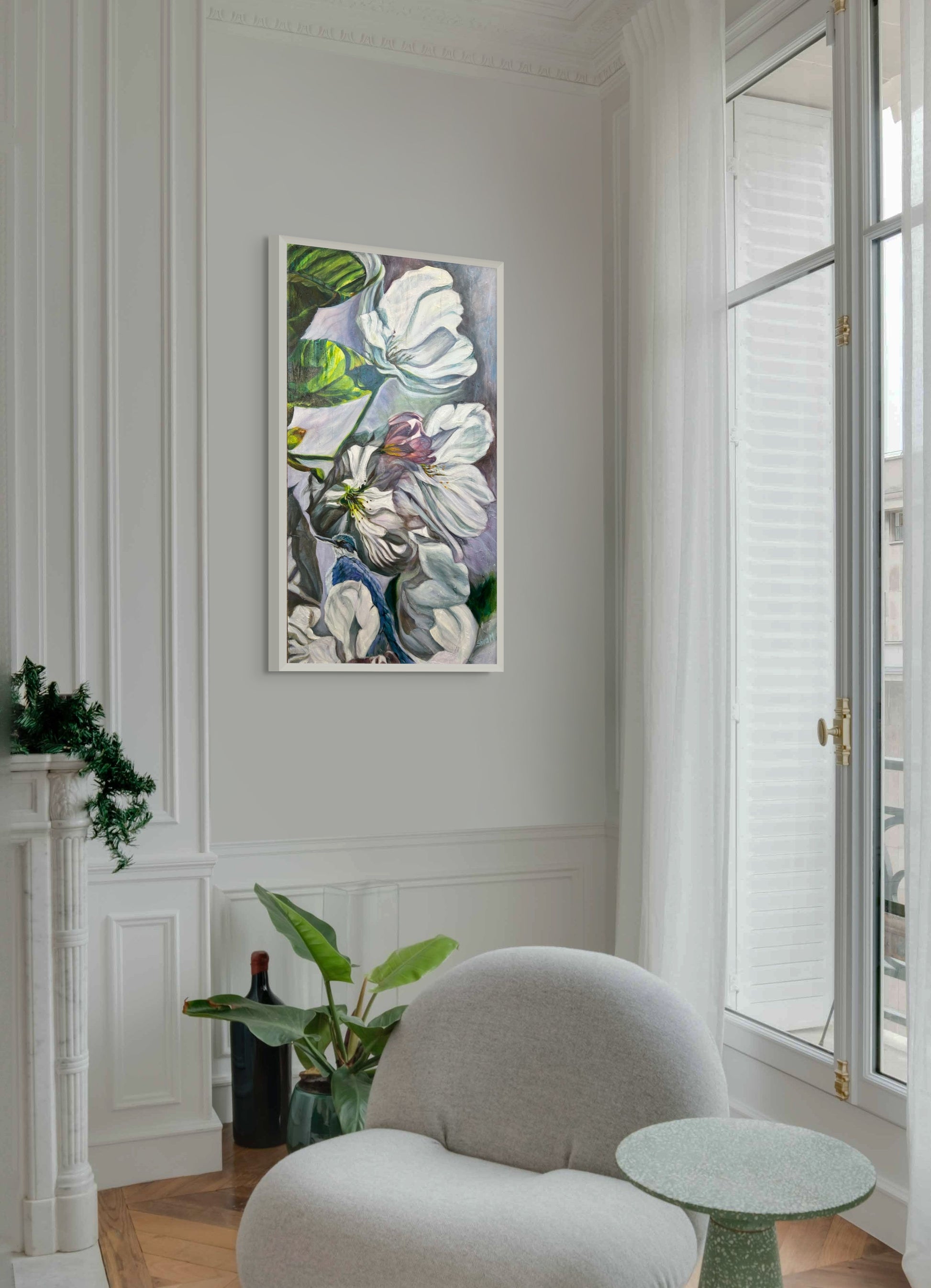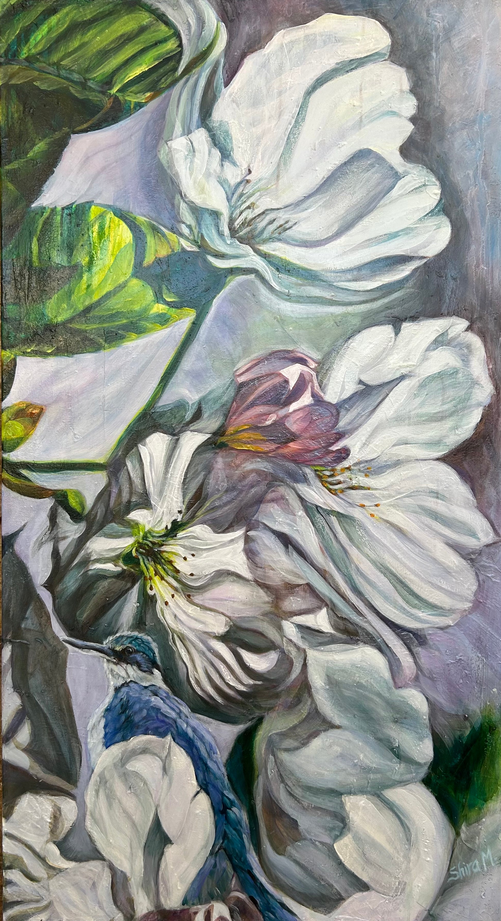 Acrylic and oil on canvas, this painting captures the delicate beauty of almond blossoms unfolding in soft whites and muted violets. Among the petals, a blue bird rests quietly, adding a sense of life and stillness. Layers of color and light create a gentle harmony — a reflection on renewal, fragility, and the quiet grace of nature in bloom.
