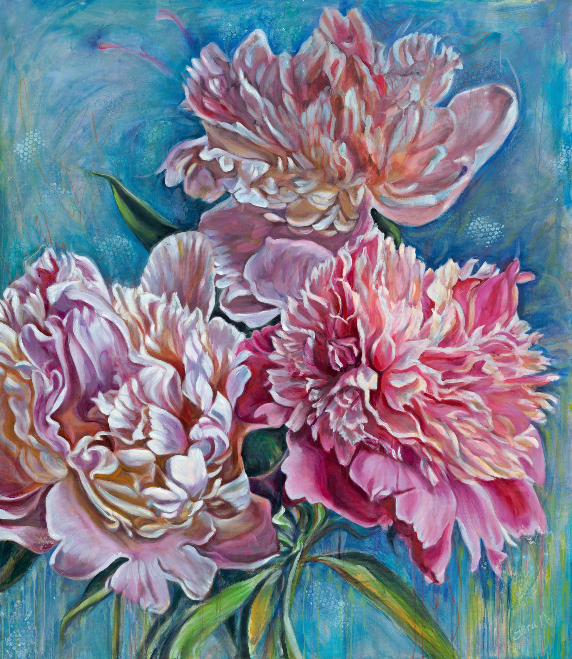 Luminous petals unfold in shades of pink, rose, and cream, glowing against a vibrant turquoise sky. Painted with sweeping, expressive brushstrokes, Blossom captures the pulse of life in full bloom — a moment of light, movement, and joy suspended on the canvas.