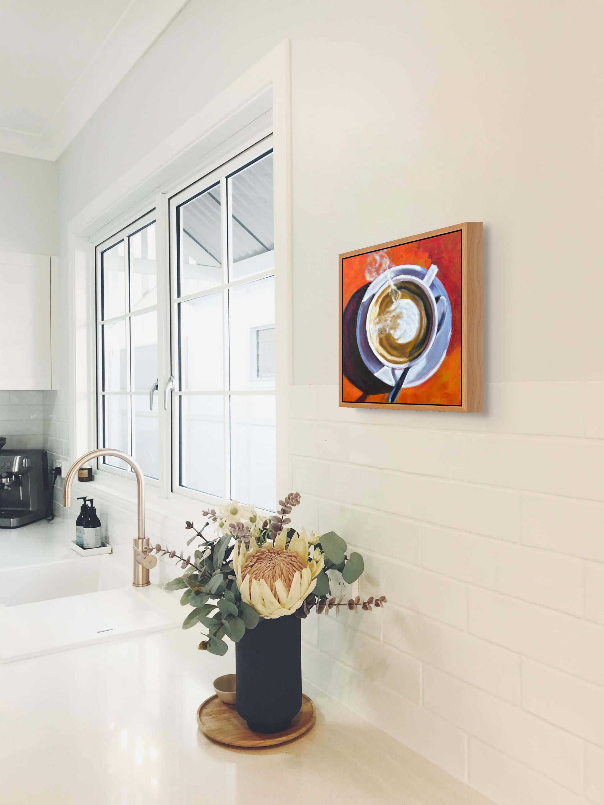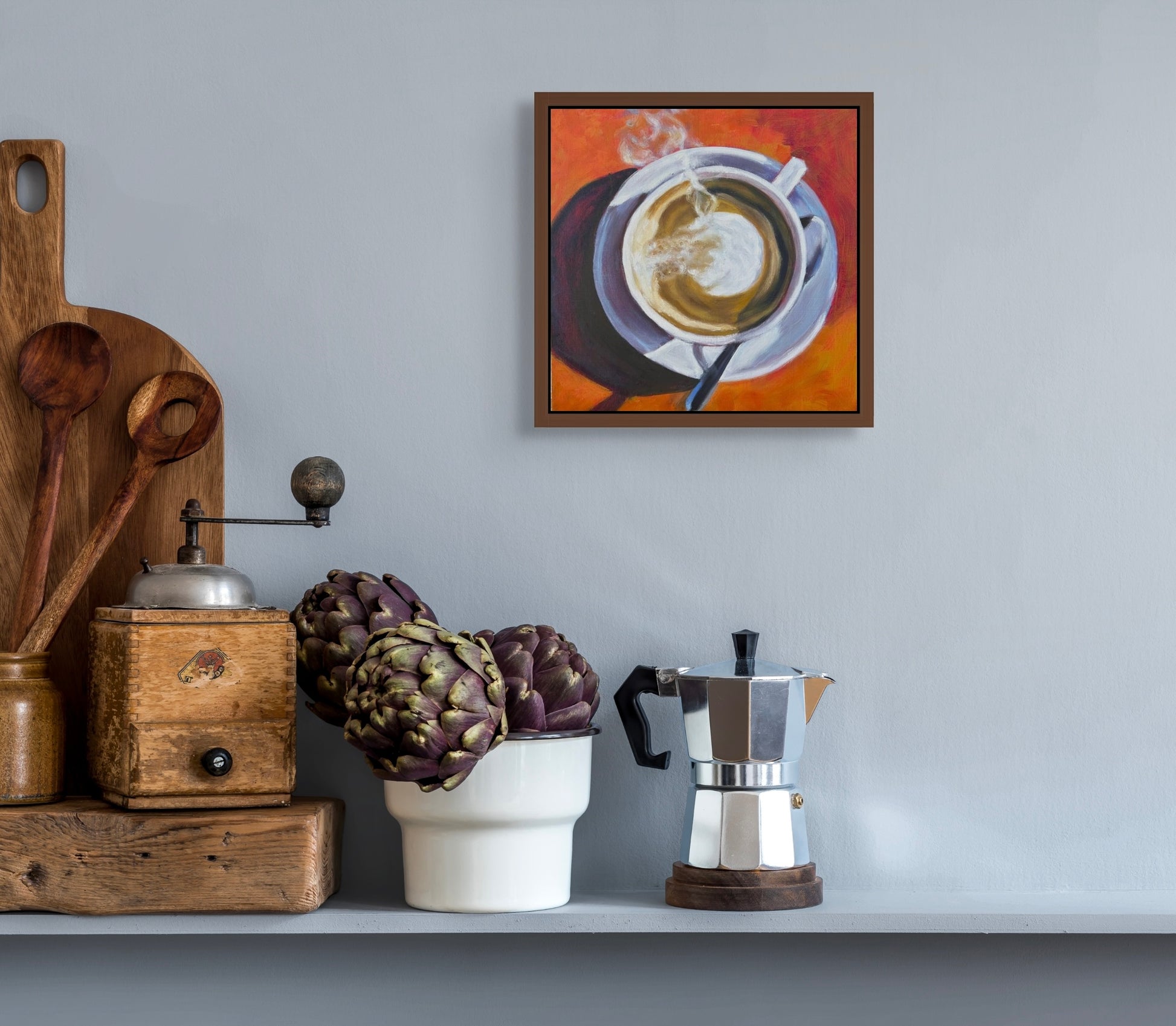 For the true coffee devotee: a frothy cappuccino in bold oils and broad brush strokes, ready to perk up your wall as much as your morning.