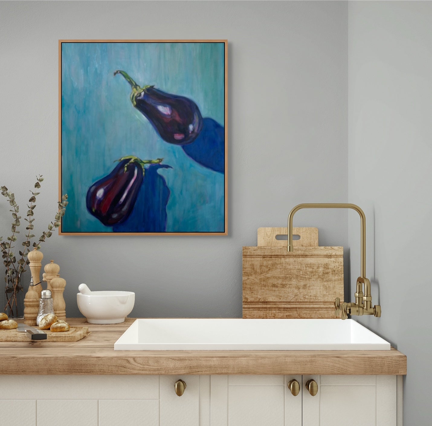 Eggplant Crush is a playful take on a kitchen favorite, floating and leaning into each other like they’re sharing a secret. Juicy purples pop against a cool blue background, giving the painting a fun, relaxed energy. It’s all about color, mood, and creating a pop in any kitchen.