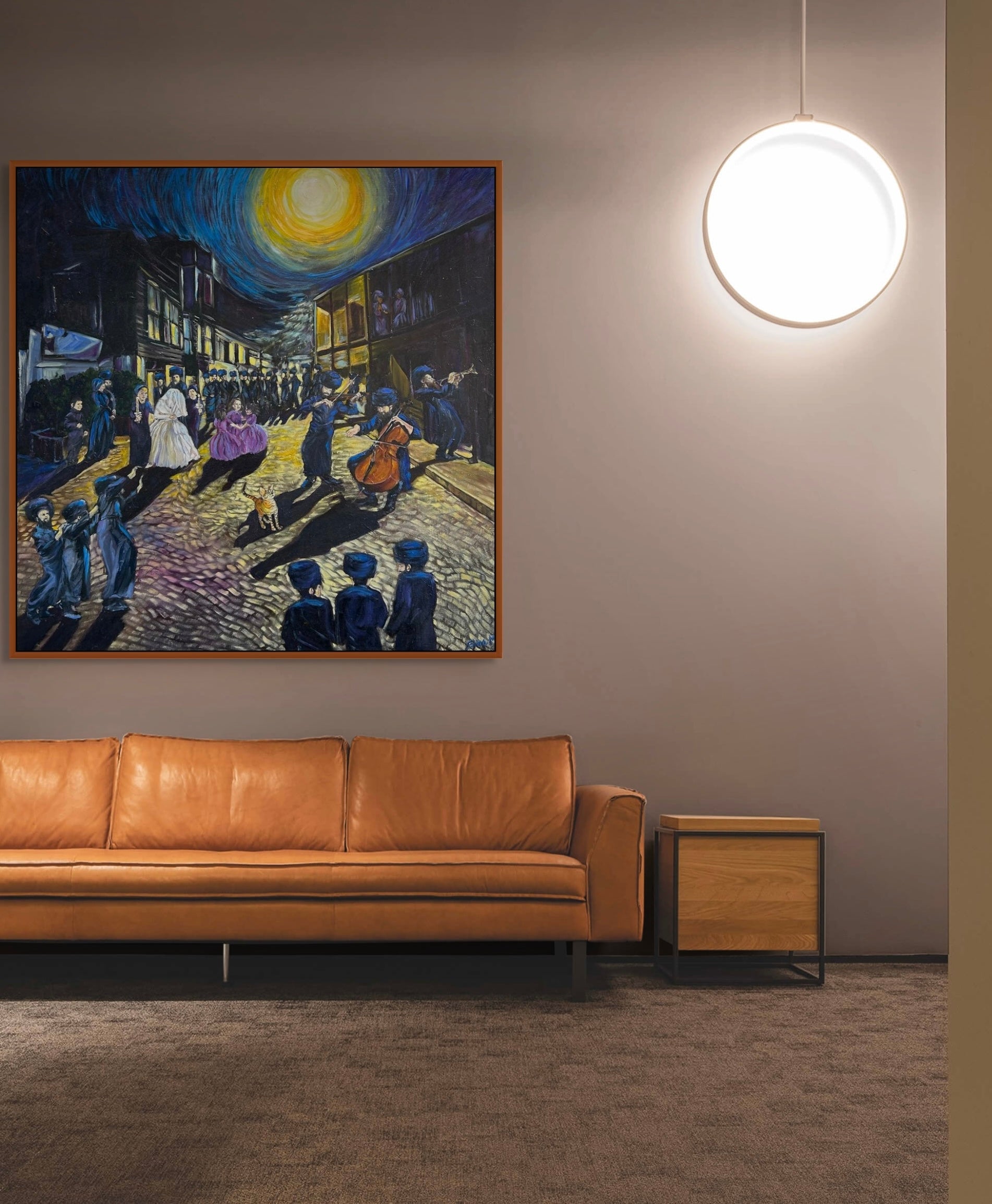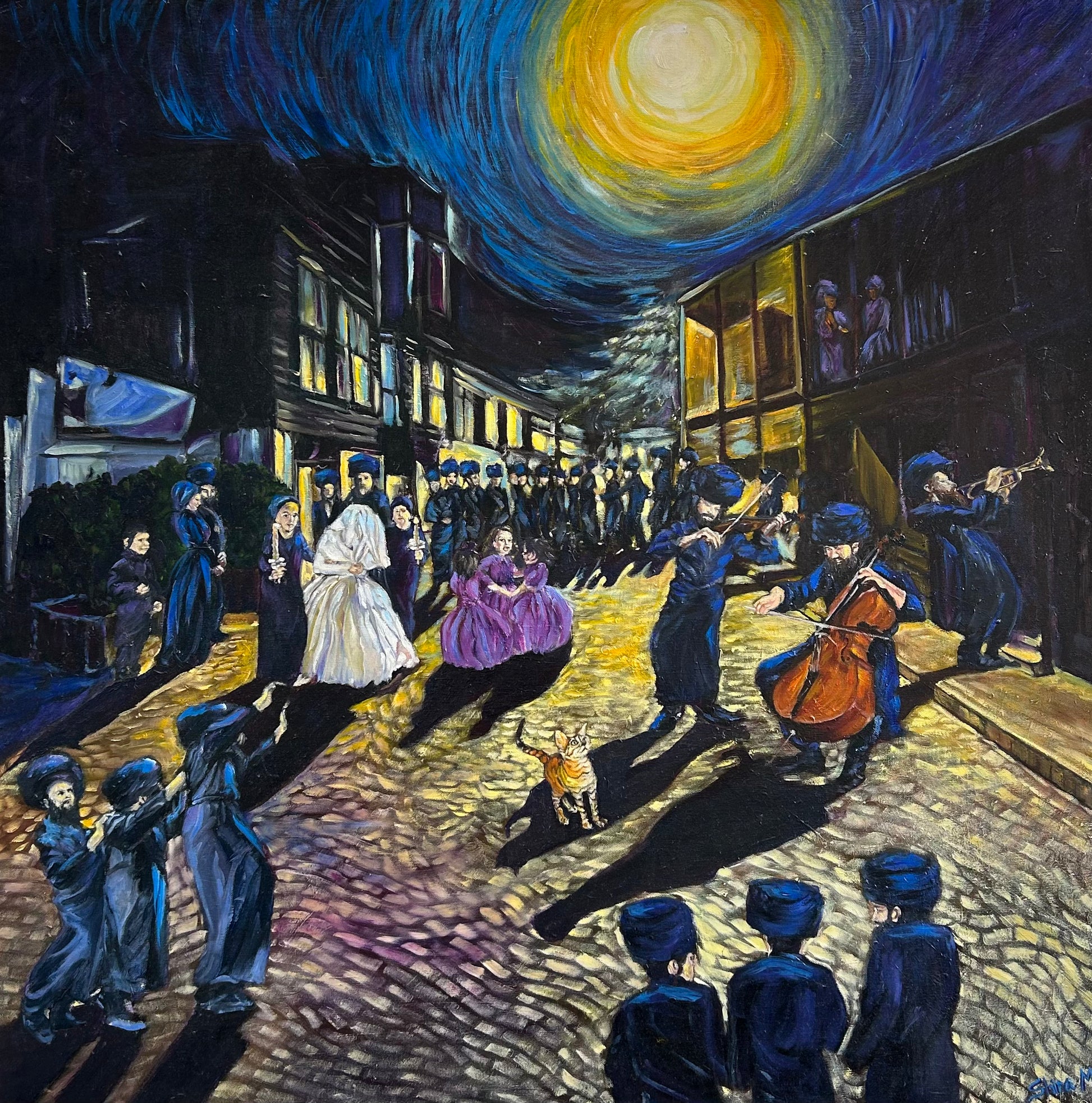 “Mendel’s Bride” captures a moonlit shtetl wedding where musicians play in the glowing street and dancers whirl around the veiled bride. Warm golden light spills from the houses, casting long shadows over the cobblestones, while a small cat pauses at the center of the celebration, adding a touch of whimsy to this lively, nostalgic scene.
