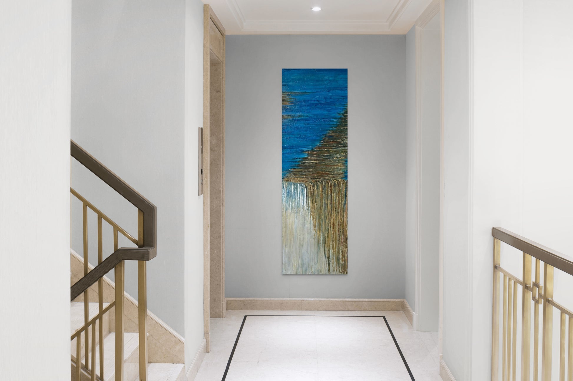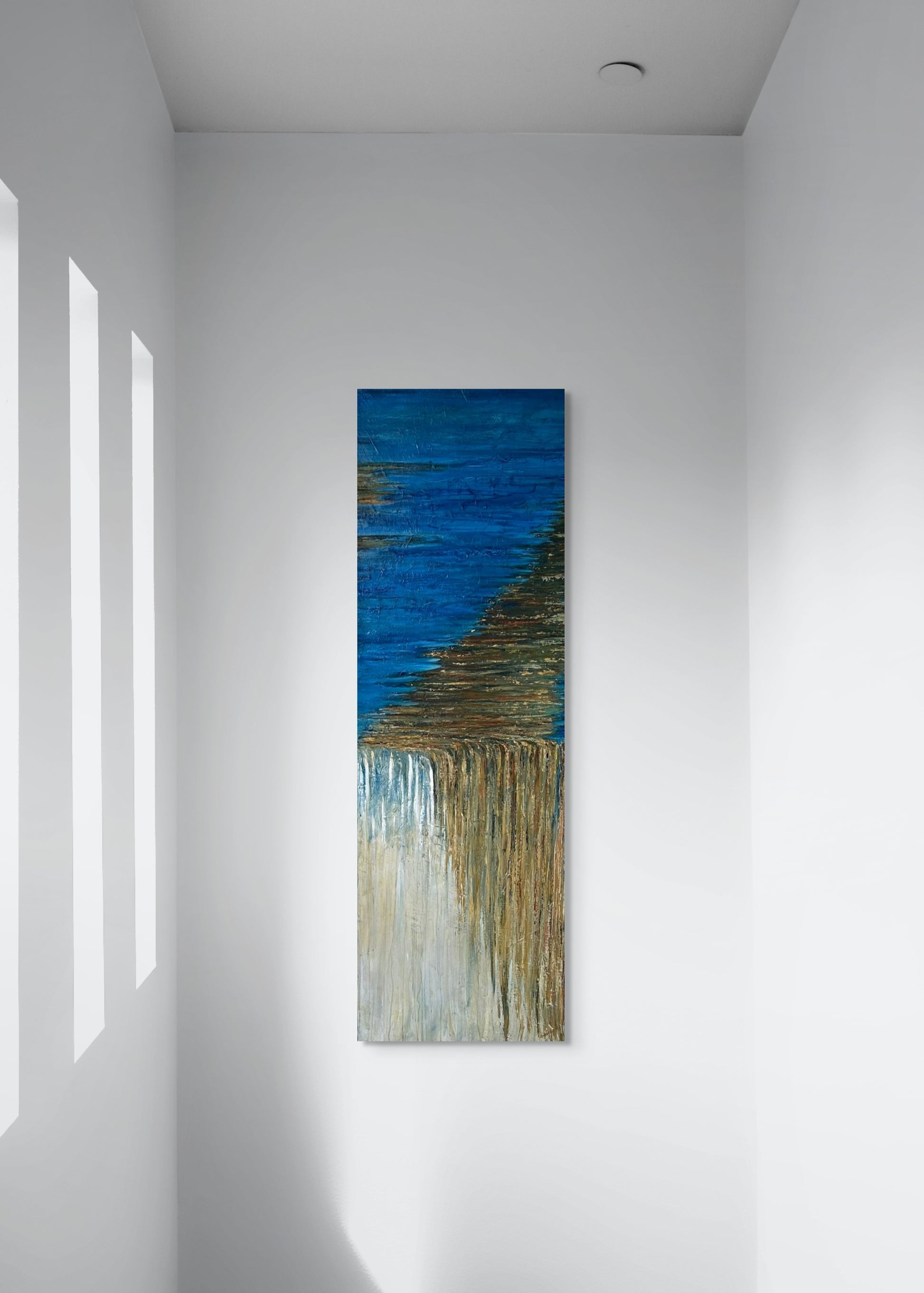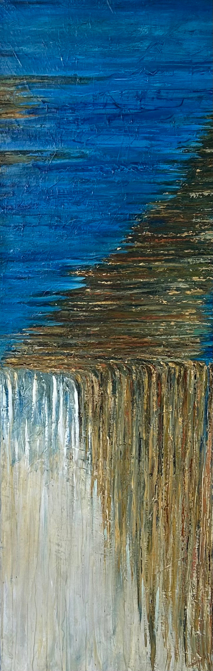 This vertical abstract painting evokes the land of Israel as a living body on the verge of tears. Painted in rich oils with delicate touches of gold leaf, the upper half is a deep, textured blue—like sea and sky fused together—crossed with rough strokes of earthy browns and greens that suggest mountains, fields, and ancient terraces. These horizontal layers suddenly break at the edge of the canvas, spilling downward into a cascading torrent of whites, sands, and muted golds.