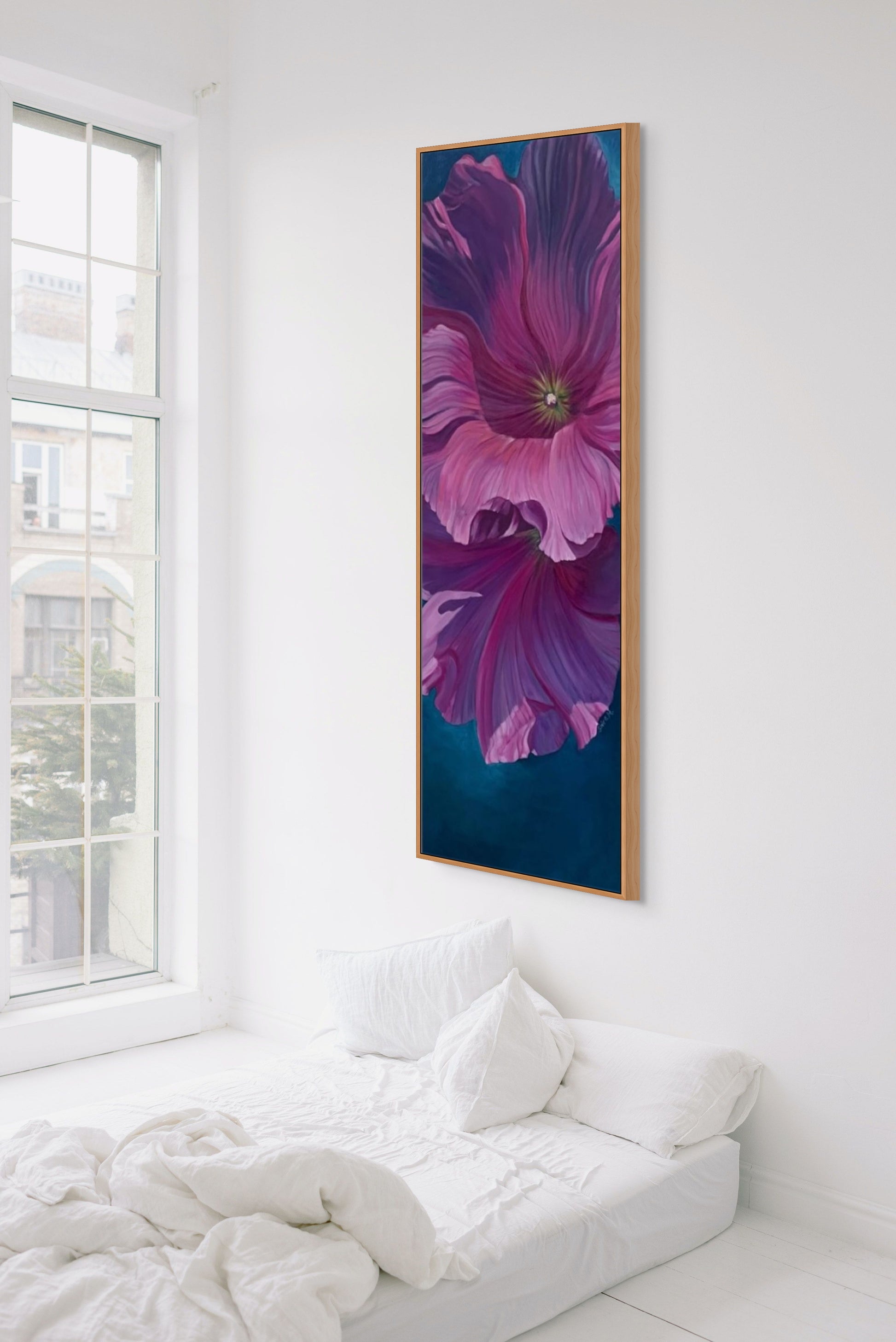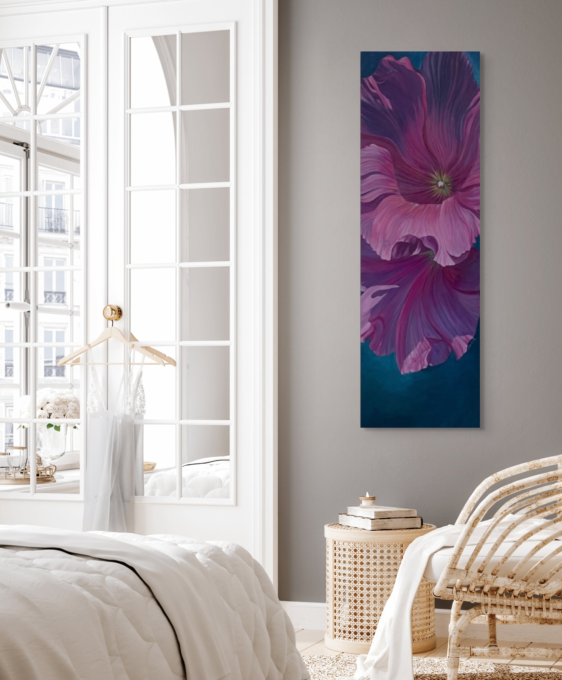 A close-up exploration of hollyhocks in deep magentas and violets, this painting captures the quiet drama and movement found within a single bloom. The soft transitions between color and shadow evoke both strength and delicacy—an intimate view of nature’s layered beauty. The teal background enhances the flower’s luminous petals, creating a sense of depth and stillness, as if the viewer is suspended in that fleeting moment of full bloom.